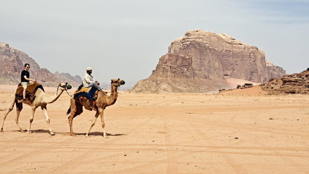 The 1-day camel tour with overnight stay starts from the Wadi Rum village, and you and your guide will first go to the Nabataean Temple. The next site you will visit will be the Lawrence Spring, and afterward you will go to The Little Bride, followed by the Khazali Canyon, where you can walk inside to see the inscriptions. Here you can relax while your guide prepares lunch. After lunch, you will continue riding to the Bedouin Lifestyle Camp where you can watch the beautiful sunset. After that, you can enjoy a delicious bedouin dinner, bedouin tea, as well as bedouin music and songs.